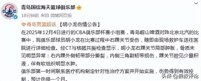 青岛男篮官方:胡小龙右内踝外侧韧带部分撕裂预计伤停1个月