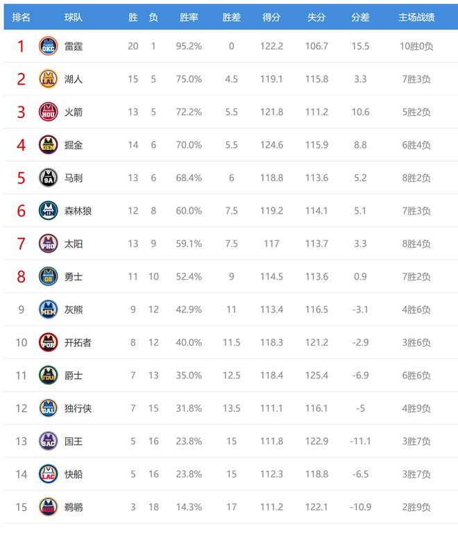 快船输球后5连败,战绩5胜16负,排名从西部第13掉到第14,国王成为西部第13。 今日比赛后快船、国王排名互换,其他西部球队排名不变。