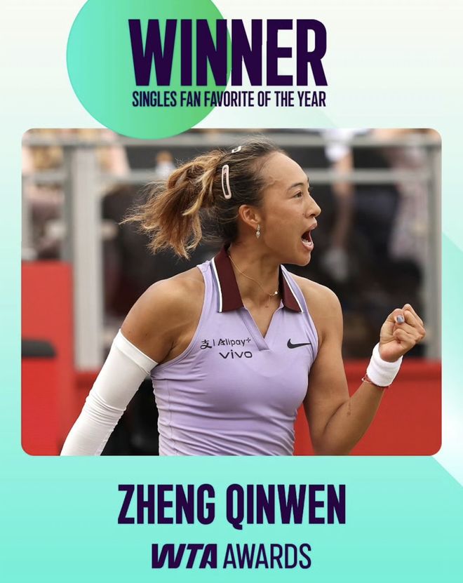 中国网球选手郑钦文连续第二年获得WTA最受欢迎球员。