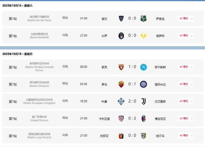 雷速体育10月19日讯 意甲目前在进行第七轮的争夺,而如今已经完赛的7场,14支球队加起来只打进了6个进球。 已经结束的7场比赛出现了3场0-0,分别是热那亚vs帕尔马、莱切vs萨索洛、比萨vs维罗纳。 只有4支球队进过球,分别是进了1球的都灵和国米、进了2球的博洛尼亚和科莫,他们也都分别击败了各自对手。 本轮还有3场比赛未赛,分别是亚特兰大vs拉齐奥、AC米兰vs佛罗伦萨以及克雷莫纳vs乌迪内斯。这三场比赛将产生多少粒进球呢? |