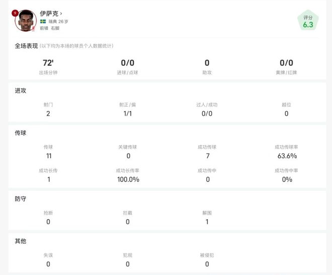 伊萨克双红会全场数据:2次射门1次射正,传球成功率63%