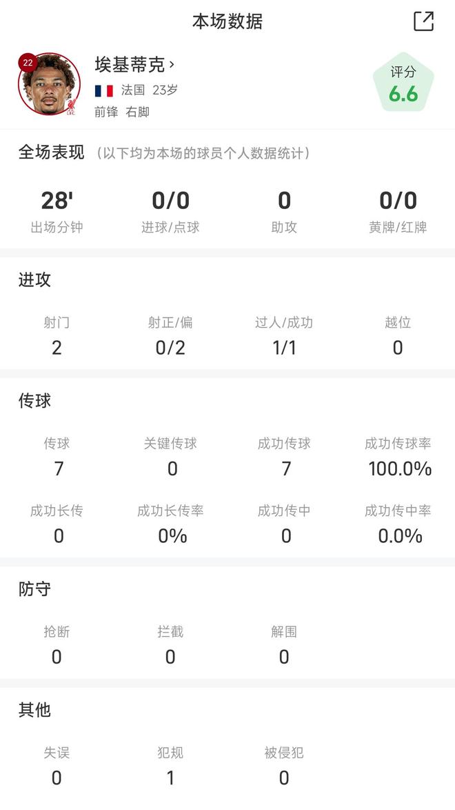 雷速体育10月20日讯 在今天凌晨结束的英超双红会中,利物浦前锋埃基蒂克替补出场28分钟未能救主。 埃基蒂克战曼联全场数据: 出场28分钟; 1次过人尝试,1次成功; 2次射门,2次射偏; 7次传球,7次成功,传球成功率100%; |