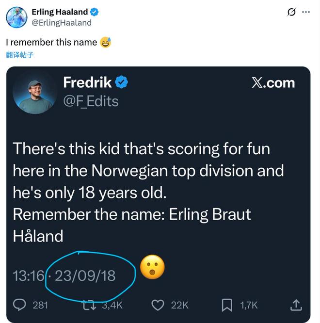 这位名叫弗雷德里克的网友2018年9月23日曾经在社交媒体上发文写道:“现在有个孩子在挪威的顶级联赛以进球为乐,他只有18岁。记住这个名字:埃尔林-布劳特-哈兰德。” 7年后的今天,哈兰德在社交媒体上转发了这位网友的言论,同时他还配文写道:“我记得他的名字。” 【上咪咕独家看英超】 |