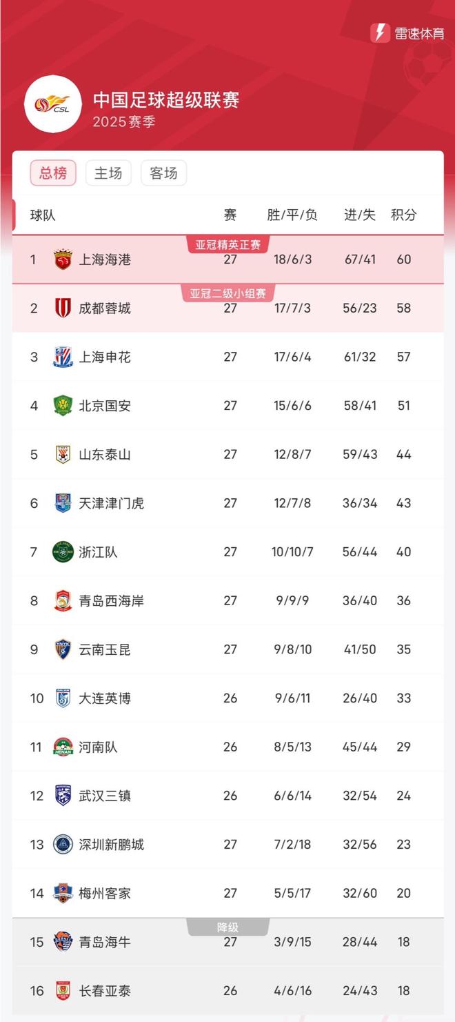 雷速体育10月18日讯 中超第27轮今天继续进行,北京国安客场1-2不敌深圳新鹏城,泰山2-2战平积分榜。 在最新的积分榜中,上海海港积60分排在榜首,领先成都蓉城2分,申花排在第三位,北京国安落后榜首9分,基本无缘争冠。 中超最新积分榜 |