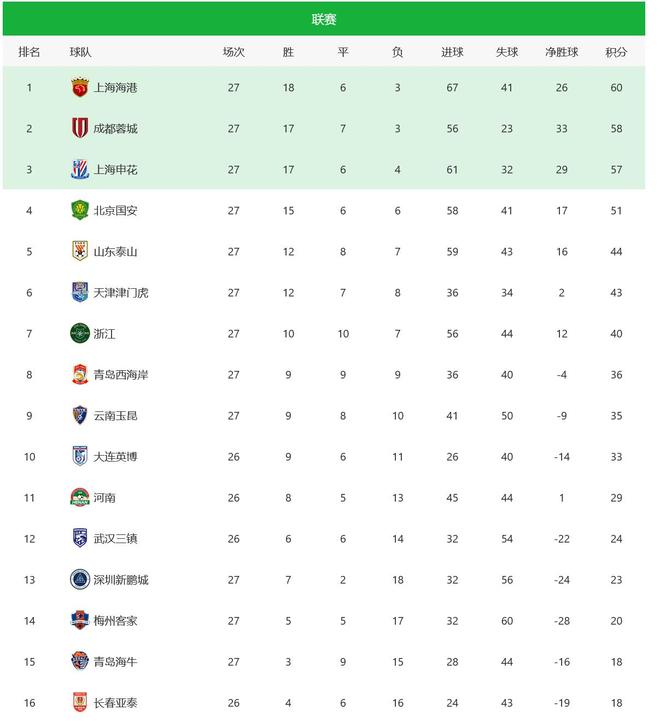 在第27轮结束2个比赛日之后,中超积分榜可以说是一夜变天,海港、蓉城和申花三强争冠进入白热化,北京国安大崩盘彻底掉队;